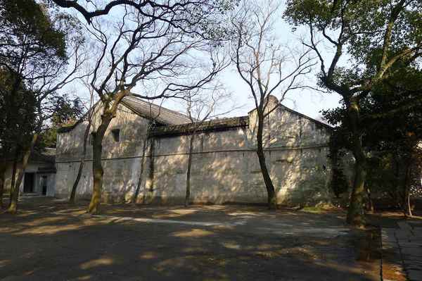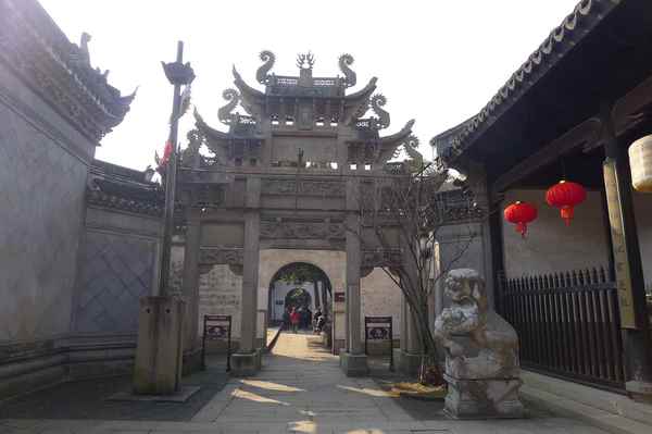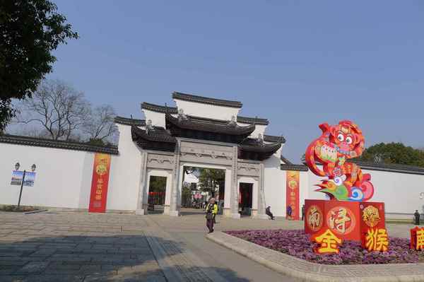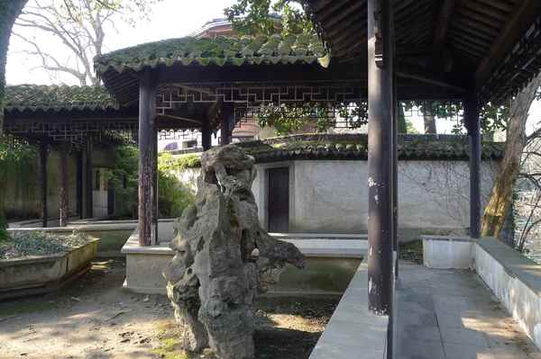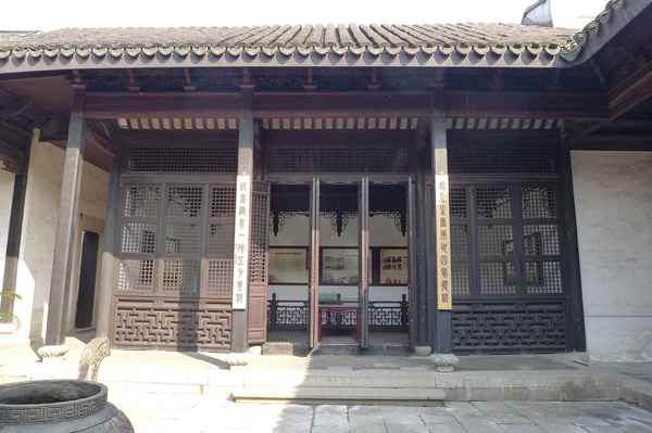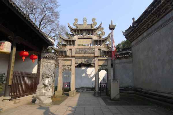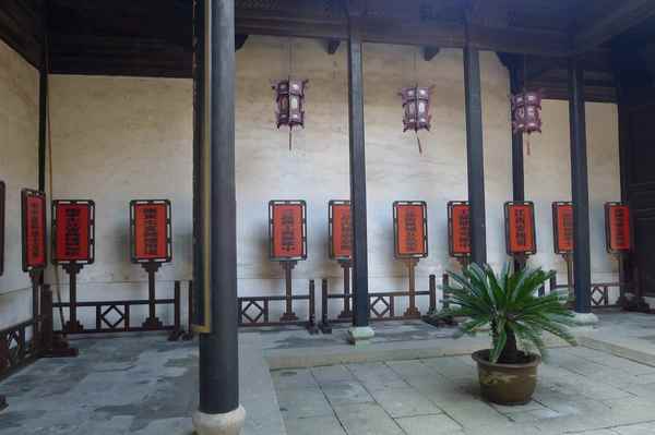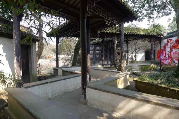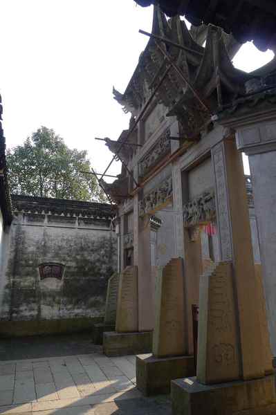 荷花池西,沿家廟東側山牆構建有一個碑刻長廊[碑廊中有以正、草、隸、篆各字體完成的作品,書藝高妙,刻工精絕,被稱為史料與藝術價值兼備的珍品。長廊壁間嵌置有《紫藤花館藏前》、《梅花仙館藏套》等珍品,有刻於清嘉慶十六年(1811)、翰林院待詔徐達源與廿余位文人學士往來投贈的詩文尺牘手跡。另有題為《顏平原劉太守序》的行書體碑刻,是「宰相劉羅鍋」劉墉所書,碑上蓋有清乾隆皇帝「御賜仙筋」印章,南北二劉走到一起,被稱作史林趣事。