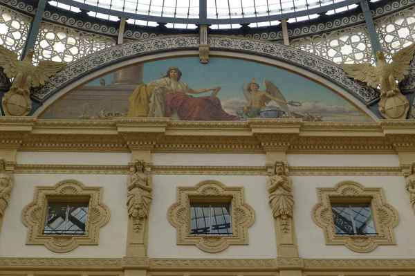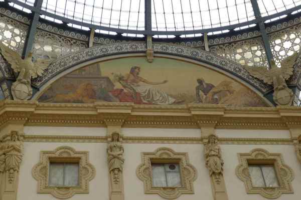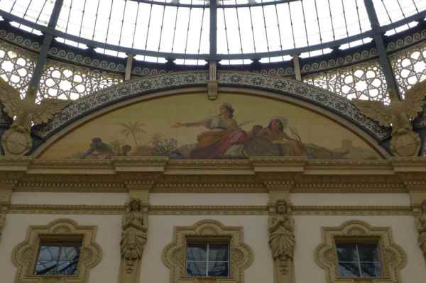 迴廊的頂端是鐵架搭配透明玻璃搭建的拱頂,19世紀時非常流行這種室內的拱頂長廊,像 Burlington Arcade London 、Galeries Royales Saint-Hubert Brussel、Passazh Arcade St. Petersburg 都是在這個時期搭建而成的,但其中又以米蘭這個 Galleria Vittorio Emanuele II 的規模最大、最出名,更是現代我們看到的,擁有玻璃帷幕大型購物商城的先驅。
