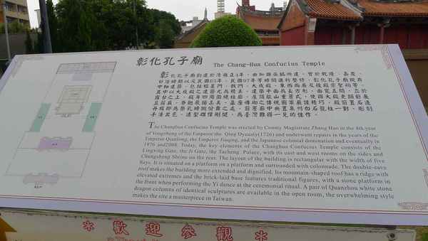 彰化孔子廟原為彰化縣學所在,昔日在縣治東門內,南向。清雍正元年(1723年)彰化設縣。清雍正四年(1726年),由知縣張鎬主其事,聘請大陸漳州、泉州、潮州師父,由大陸將建築材料船運來台,創建彰化孔子廟。初建之時規模已具,中為大成殿,兩側為東西廡,前為甬道、大成門(戟門),工為義路,西為禮門,前有檽星門,後為崇聖祠,右為明倫堂,堂後為學廨。清乾隆十年(1745年),淡水同知攝彰化縣事曾曰瑛於廟左側興建白沙書院。