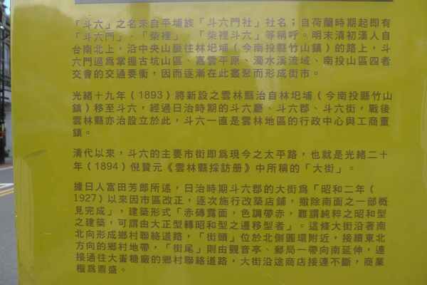 太平老街位於雲林縣斗六市的太平路上,老街上的樓房建築特色以巴洛克式風格為主體設計,於19世紀末日本明治、大正、昭和時期所建,至今已超過90多年歷史之久。每棟樓房建築為兩層樓高,於牆面及外壁上皆刻有精美及栩栩如生的雕飾圖案,除了呈現建築藝術的美感之外,還有顯赫名門世家的意涵存在。http://tour.yunlin.gov.tw/scenery/index-1.asp?id=20&m=99&m1=3&m2=13