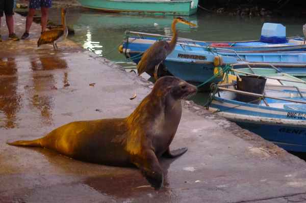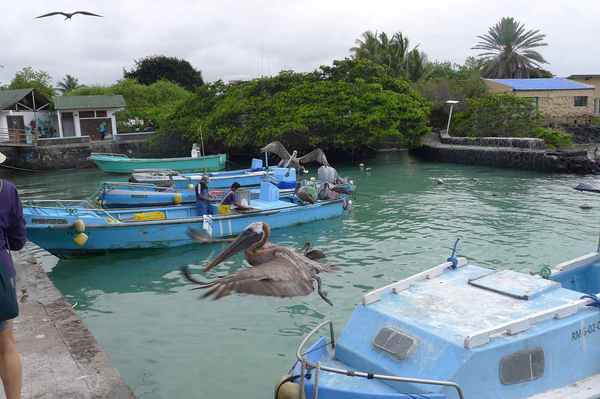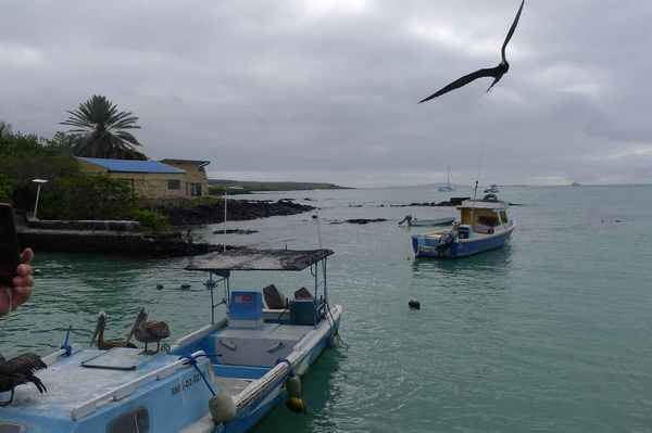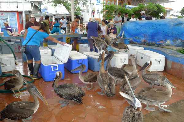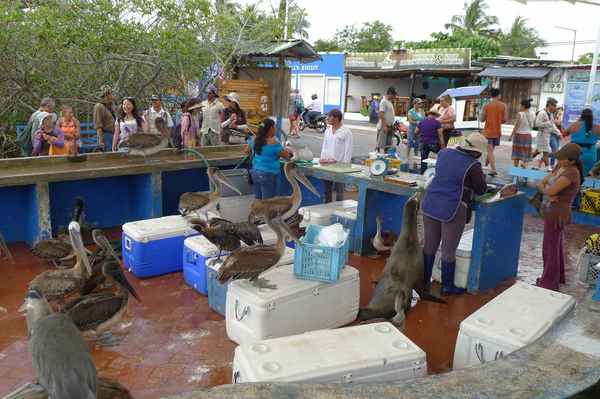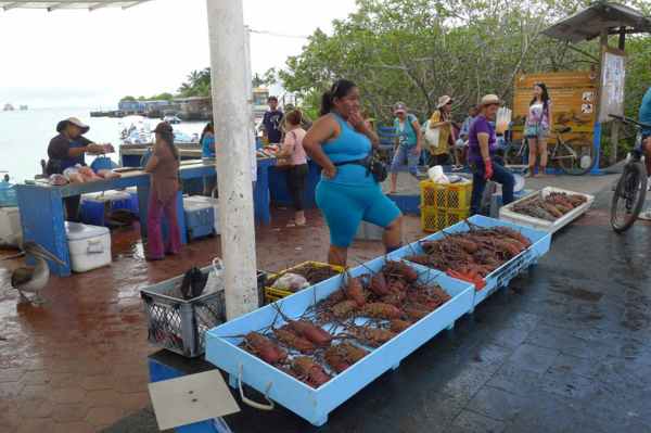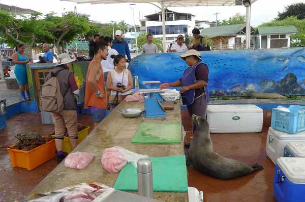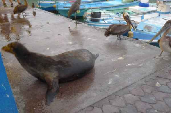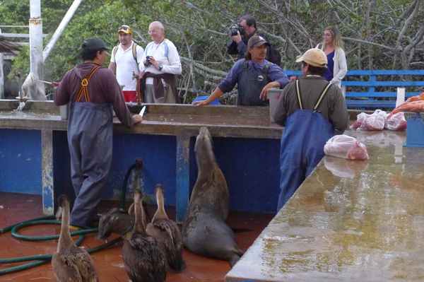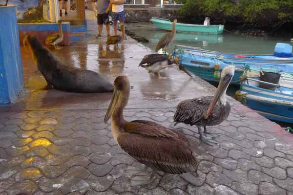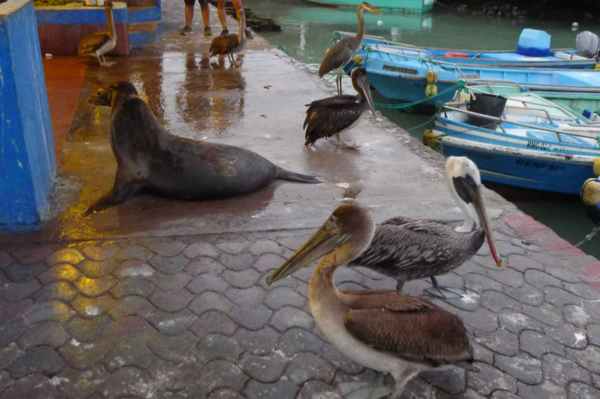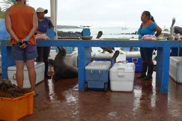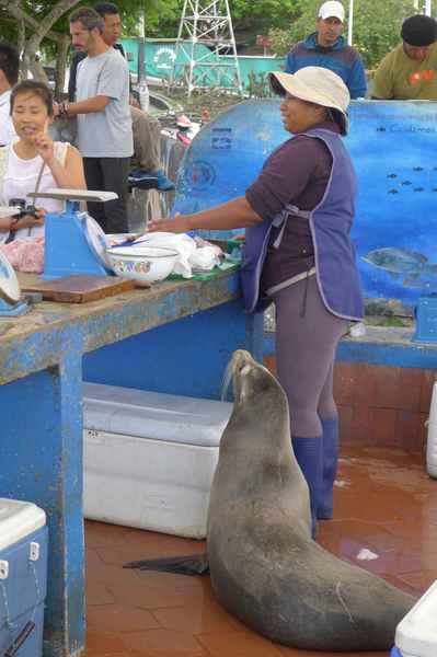 8點打包行李,又重回魚市場,看眾鳥做秀,真精彩。我們2人,加另外一對和美華 。群鳥齊飛, 軍艦鳥飛得很近,看得到公鳥的紅脖子, 鵜鶘群聚在一起,還在攤位前討殘食,一隻海豹還是站在櫃台前,看了又探頭,跟昨天一樣來回梭巡。