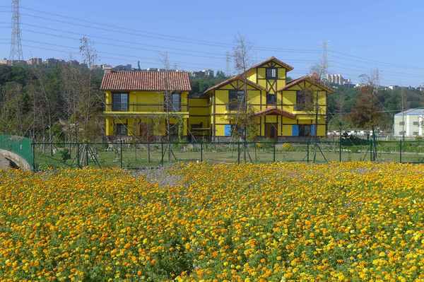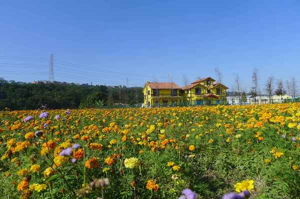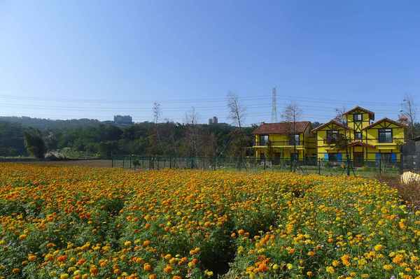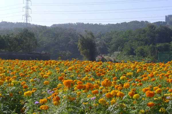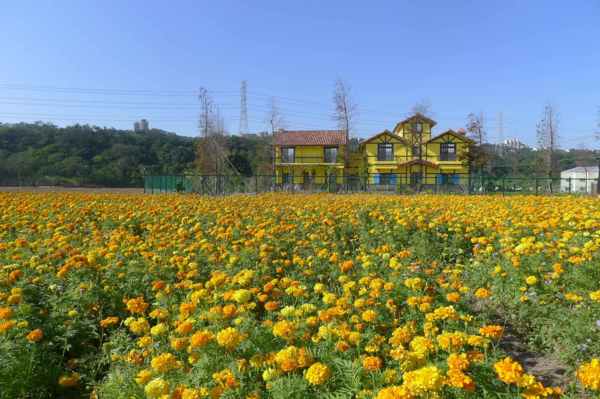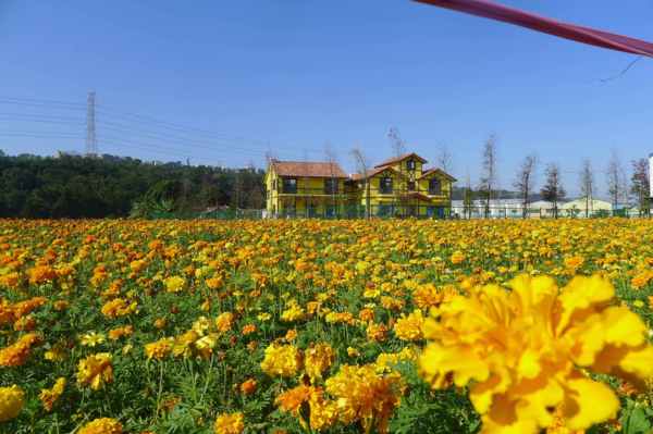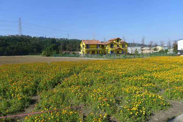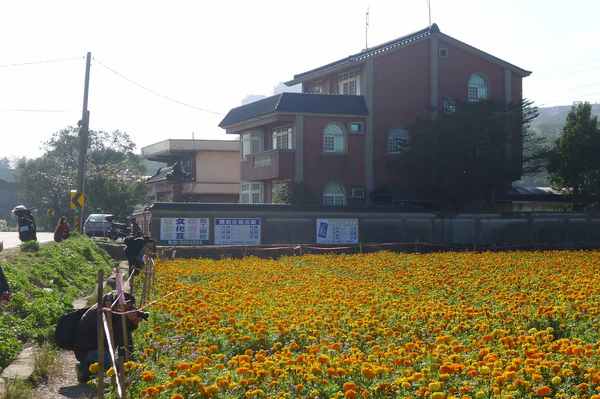 原先沿途很多韭菜花田的。今天,只看到一塊黃花田和對面一塊韭菜田。