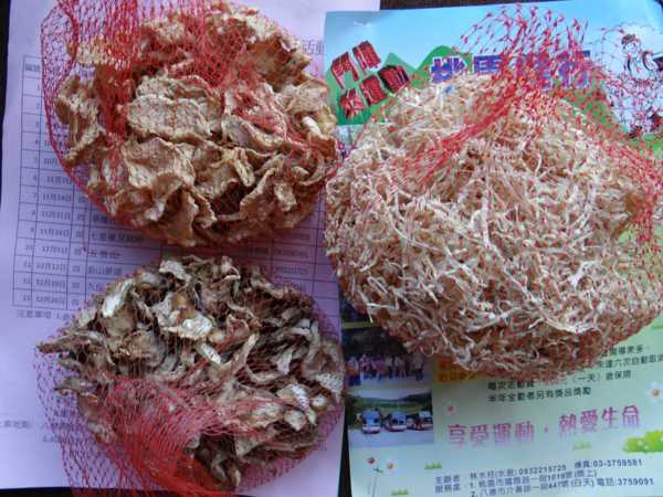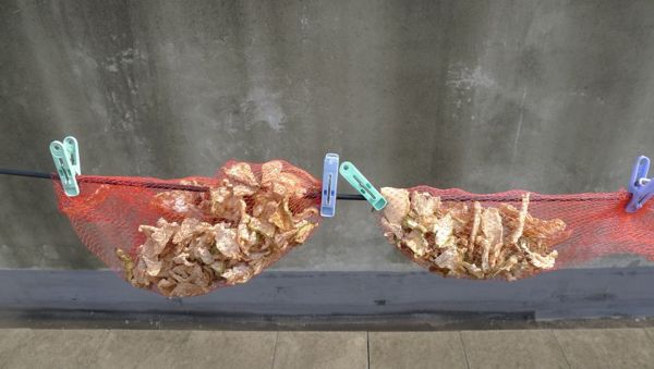 3天後裝在網袋裡,夾在曬衣繩上曬。
