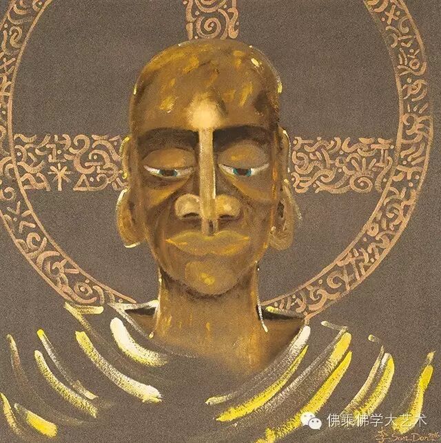 在得道的時候開始要進入自他不二,所以得道時眼睛睜開,真正到證時眼睛是睜開來,因為要面對眾生,後面十字影射十方眾生的意思,所以這幅眼睛睜得最開,眉心有毫光。聞、悟、得、證,看毫光看眼睛,就好像見山是山。來悟時眼睛是睜開的,悟的時候好像見山不是山眼睛就閉起來,得道的時候又是見山是山,最後就我是山水,山水是我。