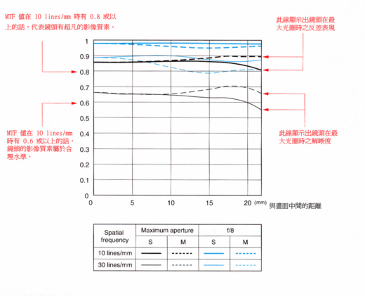 圈,對焦方式則設為無限遠對焦。雖然MTF特性圖並不包括另外一些選擇鏡頭時的重要考慮因素,例如尺吋、價格、處理、最近對焦距離、自動對焦速度、像差、明亮均衡度以及是具備可提高影像質素的影像穩定器等,它不失為一個技術性的參考,從中得知個別鏡頭的光學特性。