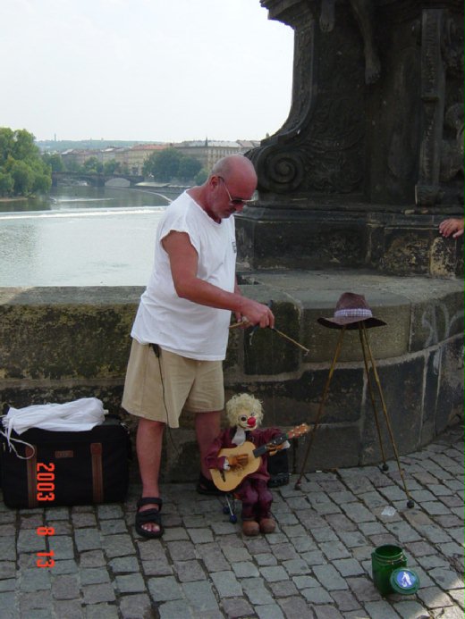 長長的查理士橋是布拉格最古老的一座橋,兩側有30座聖像,每一座人像背後都有一段宗教故事。光是一個個看,就要花上不少時間。另外橋上還有許多街頭藝術家擺個小攤子,賣自己手工製的裝飾品;畫家展示自己的作品,甚至現場作畫;還有像照片上的人偶表演。