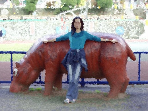 由於假日沒有學生,我們便坐在樹下吃東西,椅子前方有一隻大河馬,童心未泯的我們輪流在河馬旁邊照相,等到東西吃得差不多了,我建議幫二姐一家人拍一張全家福,姐夫和他兒子先合照,之後等待二姐入鏡。