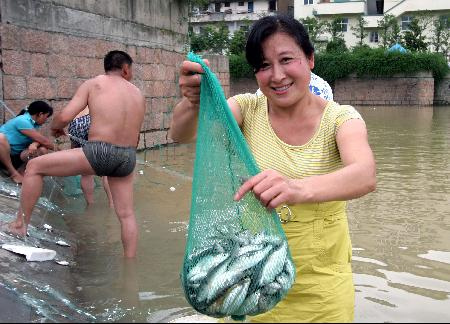 圖為2008年6月22日,新華社的新聞畫面,強降雨造成浙江部分地區受災,大批逆魚隨洪水逆流而上游至浙江德清縣,當地居民紛紛找來漁具下水捕魚。