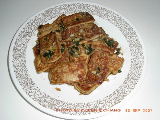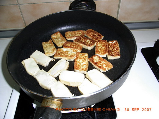 加入煎好的老豆腐塊,並淋上醬油、酒及一點糖,去燴燒入味後就OK啦!