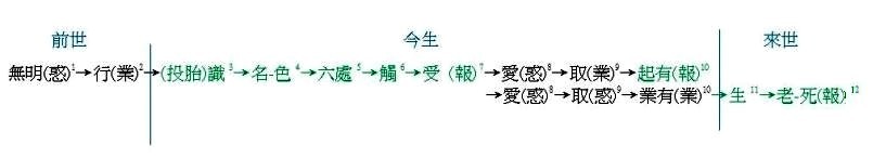 09) 所以,有無明而有無明的行,有無明的行就會有識。而識是報,因此我用綠色寫。識入胎就有名-色,有名-色以後就有六處,六處會有更樂,有更樂會有覺,這一些都是報。可是之後因凡夫對於報是啟動有漏的反應,所以又變成黑色的,也因此有有漏的生-死。