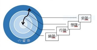 修觀禪之初是進入一個相較粗糙的身受心法之觀照,如上述觀察自己身體上的感受及心理上比較粗顯的念想、情緒等。若再進一步深入修觀禪,可以援用葛印卡老師把Vipassana( 毘缽舍那)翻譯成「內觀」譯辭的概念法;此謂「內觀」是指在自我觀照的基石上,更推進去觀照生命內在幽隱的心地風光或心行──受蘊、想蘊、行蘊、識蘊等心蘊運作,四蘊如一同心圓,以識蘊為中心,心意識的波動向外擴散並回流印記;這階段的內觀就更聚焦自心觸即現前境的「受、想、行」運作機制。換言之,如何內觀覺照更細微的「心行」呢?也就覺照「受、想、行」三者相互干擾、相互牽動、相互引生之心路歷程。「受、想、行」好像一條捲捲的蛇盤旋內隱於心田中,覺照者只要能夠內觀照見這條蛇是這樣活動,就不害怕蛇的存在,也就有辦法正確地擒捉著蛇頭制伏之。學子如是信願行:唯正念且真誠地對待自己,才能夠勇敢地推著自己去處理不善的、雜染的心蘊問題,而令一切心行皆清朗、坦蕩、離繫,及至解脫苦。