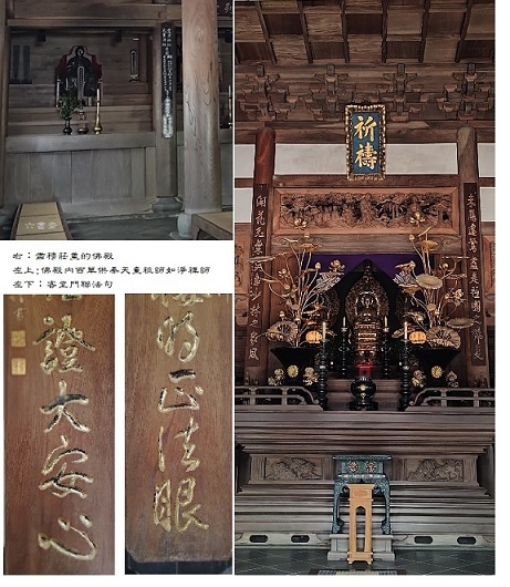 怎麼辦開放時間未到?行腳僧斗膽地走向前,拾級而上,回望來時路,門裡門外,心內心外,如是靜安。數分鐘後,仍無人可探問,於是自行決意沿著參觀路線的指示標入寺參訪。脫下僧鞋,著襪緩行。首先走入僧堂,見如此熟悉的天童寺禪堂格局,好不歡喜啊!仔細地看著每一處、每一物件、每一名修行僧名號掛牌,也向堂內中心位的獅子坐騎與文殊菩薩問訊;文殊菩薩的坐騎是獅子,獅子表徵智慧和勇猛,整體造像代表文殊菩薩以般若智慧的利劍去斬斷各種煩惱根,並以獅子吼之威震懾諸魔行。最後,想像著在此經歷一次次的禪法修持,該是法喜充滿,當是深入觀禪(Vipassana毘婆舍那)法味而能捨心悅意為食吧!