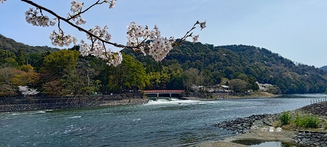 走在六點半的朝霧通步道上,感覺自己像是拜訪隱士的後花園,領納此時此地的靜謐,靜然的塵境裡流淌著濃濃的「大和(YAMATO)」風骨。我在其中走過也看到了朝霧通上的家屋、文創商家、陶窯庭園、抹茶工坊、歪斜45度高聳且斜跨小巷兩端的老松、神社鳥居等和諧共榮之景;更邂逅一段無預期的櫻花步道,入步道前端立著一白木板,走近佇足,讀著告示:「美化社區,勿拾落櫻」,這是此處聚落人們的共識吧,許彼此在花開花落中與無常之美共舞共享。見此美景,我選擇轉入緊臨宇治川畔的一小石板道,在一石階梯上安坐,深深地呼氣,深深地吸氣,花香與心香一一供養十方諸佛與有情;睜眼看著眼前櫻枝與流水,她們交流些什麼信息呢,也近觀晨光裡花團錦簇的繽紛與明亮,也遠觀青山前那一座朱紅色朝霧橋橫跨此岸與彼岸;霎時,人間的時空概念消逝在川水聲流中。人間淨土的豐盛感,當如是吧!
