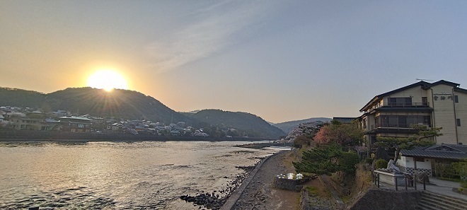 轉身走在具有百年歷史性的古橋(全長153米),是被認為連結現世與彼世的橋樑;於是,走走停停,看遠看近,看上看下,去體受這座於1996年採檜木重建的宇治橋,是如此美好地融入宇治川的自然景觀。放眼看那日出東山映照宇治川之波光、家屋、山脊線,領受光、水、微風和合成就當前明亮閃耀之景,美哉!突然之間,一隻吉娃娃犬在我身旁婆娑起舞,牠的熱情貌使女主人與我相視而笑,彼此單純的心行使得美上加美,如是安靜地顯化在三口之間。過了橋,右轉沿著宇治川旁的朝霧通步道向東繼續走去。
