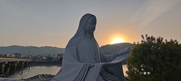 不久走到橫跨宇治川的宇治橋,據日本觀光局官宣云:「宇治橋的周邊地區,是可以讓人回看日本真實歷史和虛構故事的『起點』。文學經典《源氏物語》的場景,與日本茶史中的真實生活事件,交織出宇治的豐富文化背景。」於是,向東過馬路到橋頭西側會見平安時代知名女作家 紫式部石像(造像高一米八),聯想其著作《源氏物語》長篇寫實小說,也感念釋尊法教:「一切有為法,如夢幻泡影,如露亦如電,應作如是觀。」