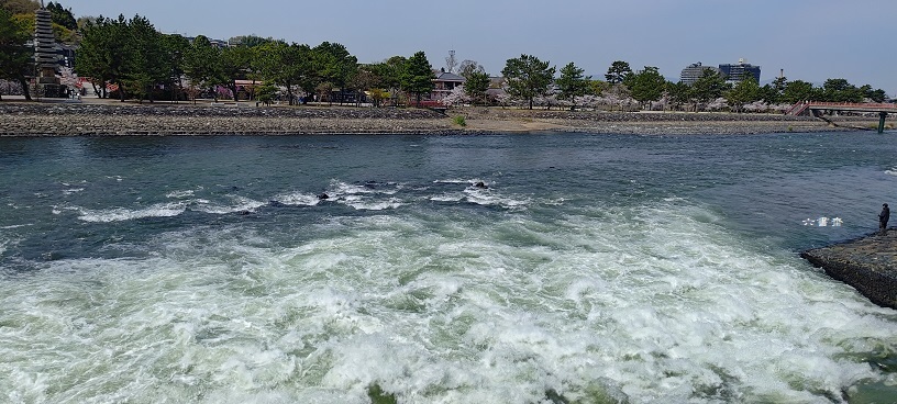 安坐川畔默照六觸處後,背起行囊,輕快地起身,懷著川水與繁花贈予之豐盛感繼續前行。走著走著,劃破靜寂的水流聲景,如雷貫耳!是瀑布?幾步路後揭曉聲源,是宇治川發電所下放水之激流聲響,算是短版的瀑布吧。行腳僧索性隨現前緣境,安心地站在觀流橋上,面對著彼岸高聳的十三重石塔,諦聽轟隆巨響的流水聲,試著體會「入流亡所」之狀態;當心識流匯入水流,如是能所合流於剎那生滅中,止息了緣境思慮心所,若「不思善,不思惡,正與麼時」。自忖:明覺心相續安住的當前,是還其本來面目?行腳僧此時無決定性的勝解,那麼來去興聖寺請益求解吧。