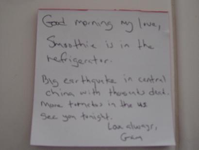 自從做了植牙手術後, 我的三餐主食除了嫩豆腐之、優格、蛋糕外, 就是蛋了!!! Gary每天早上上班前, 便會打一壺综合水果Smoothie放在冰箱讓我可以在早餐及午餐時佐餐用. 今天早上冰箱裡有磨菇, 醃橄欖, 青椒, 紅椒,洋蔥... 應該可以做一道香噴噴的Veggi Omelette. 於是拿出所有的材料.鍋鏟, 切切洗洗...Voila, 一份香噴噴的早餐十分鐘內搞定.