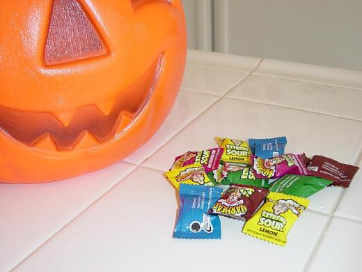 回到家後, 我便迫不及待地想嘗試吸血鬼強力推薦的糖果. 沒想到一放進嘴吧裡, 我整個人就差點兒衝到天花板上, 實在是酸到讓人快要抓狂....當第一組的小鬼看到我的南瓜提籃裡有這個糖果後, 馬上便跳起來地說, "Cool!" 可見吸血鬼說得沒錯.....也許, 因為今年的萬聖節是在星期五, 所以晚上來了很多的小朋友, 而這些小朋友也挺識貨的, 一看到這種讓人頭皮發麻的糖果, 大家都很捧場的抓了一大把... 沒多久提籃裡的糖果便所剩無幾, 算是個皆大歡喜的萬聖節.....