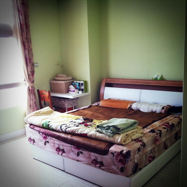 用舒服的稻香綠取代原來的亮綠色,床邊釘上白色的簡易梳妝台,再搭配花花圖案的窗簾和床罩,鄉村風味馬上就跑出來了~~