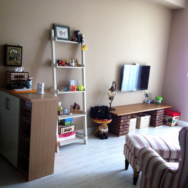 大部分的家中,都是以電視牆作為主牆,但我家卻把一進門就會看到的客廁外牆加工為鄉村風主牆,搭配自己漆的舊架子(請將左方的架子和下張照片廚房裡的架子比對XD),就成了貓咪吃喝拉撒的好地方囉~~