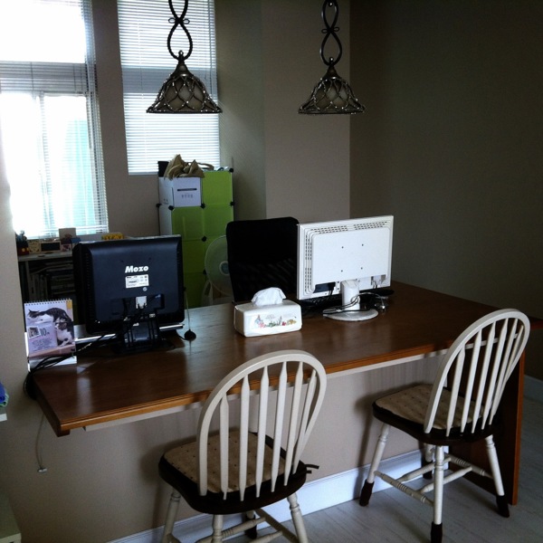我們將牆壁打掉上半段,留下下半段做為桌腳,並架上原木桌板,靠內變成電腦桌,靠外則變成兩個人用餐的餐桌,搭配鄉村風餐椅是不是鄉村味十足呢~?