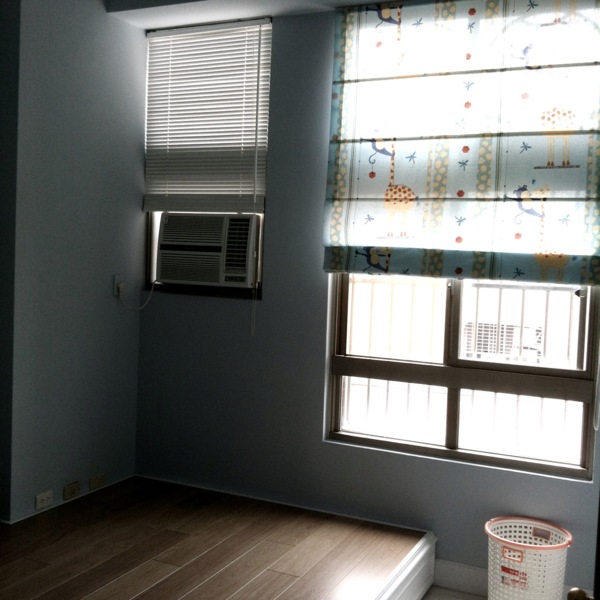 客房原來也是以塑膠地板貼底,但房間比較小,床和櫃子放下去就滿了,因此我們將客房地板墊高,客人來的時候就可以睡在地板上,墊高下面又做了抽屜以利收納棉被等~再用可愛的藍色羅馬簾和客廁外牆的藍色猴子浴門簾相呼應~整個可愛又溫馨唷~