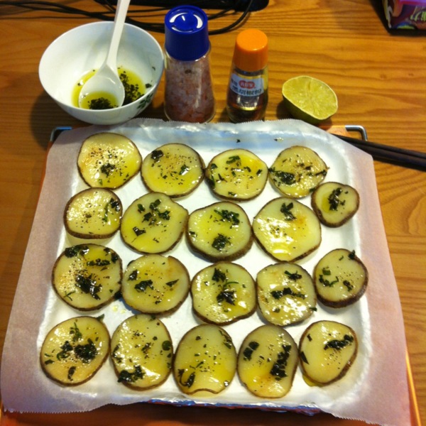 3. 將馬鈴薯在烤盤上排好 ,依序塗上香草橄欖油(做法1)、玫瑰鹽、黑胡椒,並擠上少許檸檬汁。