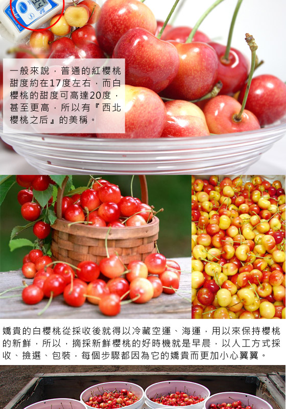 規格:西北紅櫻桃9.Row約500g+西北頂級白櫻桃9.5Row約500g/盒