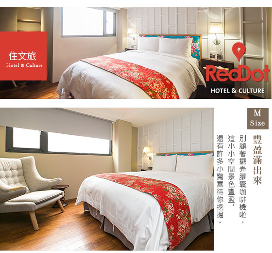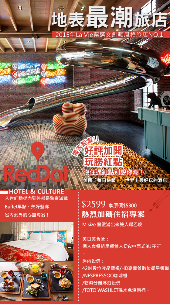 商品訊息簡述: 只要2599元(雙人價)即可享【紅點文旅 RedDot Hotel】原價5300元好評加開,熱烈加碼住宿專案:M size 豐盈滿出來雙人房乙晚+美日美食堂:個人套餐組早餐雙人份&中西式BUFFET+房內設備:42吋數位液晶電視/HD高畫質數位衛星頻道/NESPRESSOO咖啡機/乾濕分離淋浴設備TOTO WASHLET溫水免治馬桶。