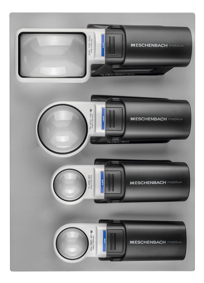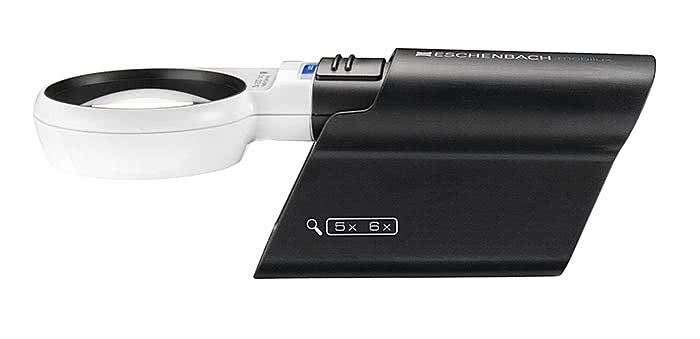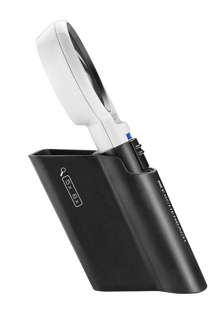 德國 Eschenbach為mobilux LED手持型放大鏡所設計的專用底座,只需將放大鏡握把插入底座孔中,即可做為固定焦距的立式放大鏡。