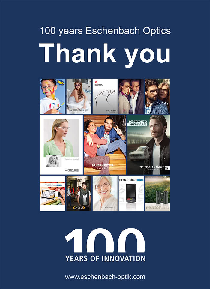 德國Eschenbach光學成立於西元1913年,為領先全球的視力輔具德國製造商,致力於設計與生產高品質的閱讀用放大鏡、工作用放大鏡、放大眼鏡、老花眼鏡、濾光眼鏡、電子擴視機等,擁有各種光學尖端專利技術與專業人才。 瑞士、奧地利、義大利、丹麥、法國、荷蘭、美國、日本、西班牙、波蘭、捷克共和國設有子公司,全球銷售超過80個國家,提供使用者最完美的閱讀體驗,以及協助弱視、低視能患者視覺輔助。華堂光學為台灣地區總代理。