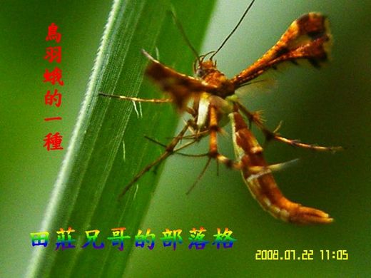 找不到就是找不到........剩下"蛾"科....但心裡想這是蛾類的嗎?於是放大照片.看看頭部...疑..有點像"蛾"....找到蛾的目錄...終於找到了...但只標明"鳥羽蛾"...