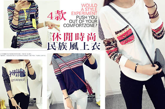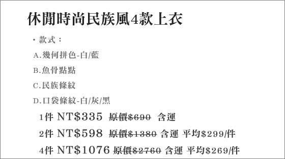 | 休閒時尚民族風4款上衣-引領異國風情的時尚潮流!個性線條與圖騰印花,交織出與眾不同的雅緻氣息,舒適合身的版型活動也方便平均每件最低只要269元起(含運)即可購得休閒時尚民族風4款上衣1件/2件/4件, 售價:269 我要購買 |