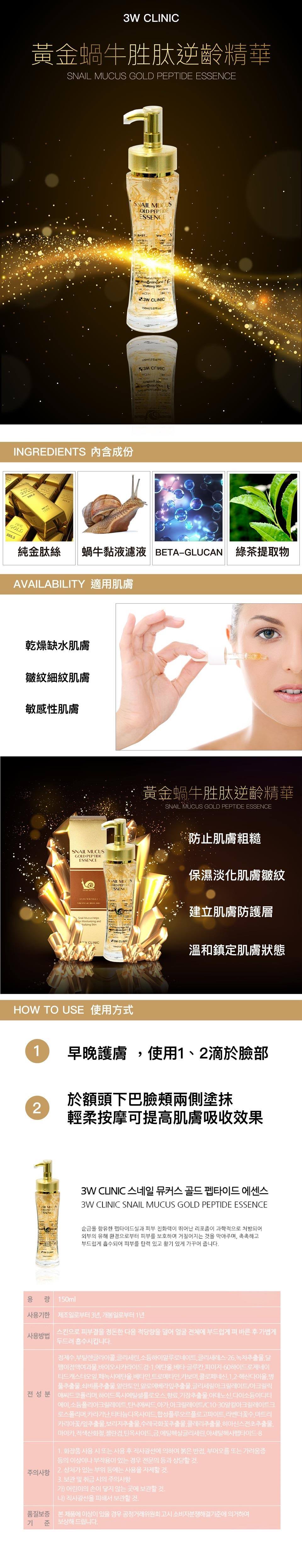 這款【3W CLINIC】黃金蝸牛胜太逆齡精華 150ml(24K黃金胜太 抗皺 精華液)在網路也看到一些介紹影片,是一個很不錯的選擇