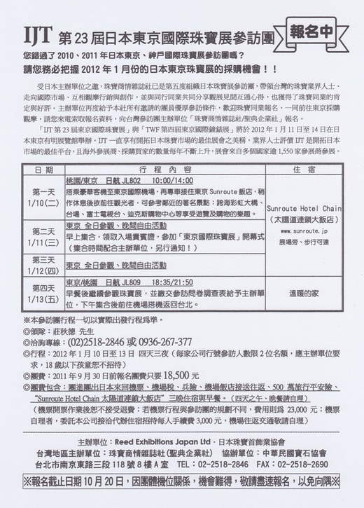 2012年1月IJT 第23 屆日本東京國際珠寶展參訪團,報名中!!