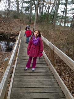 抄小徑到學校約是五六分鐘的路程,沿途還可以穿過樹林,走過小木橋,只要天氣許可,通常都帶著他們走路上學,他們喜歡研判雪地上不同小動物的足印,也喜歡停下來觀察小河流結冰的樣子,對大自然仍充滿好奇.記得以前有個朋友感慨地說現在的小朋友物質條件優渥,待在家裏看電視玩電腦的時間多了,相對的與大自然相處的時間少了,有些小朋友長大後不知如何與大自然互動,很可惜!