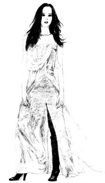 這是以鉛筆繪出的圖案,以服裝雜誌上的明星照片為藍本;除了人像之外,亦表現出服裝的質感及層次。