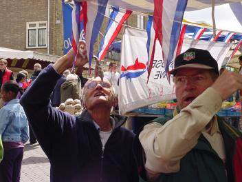 在好奇心驅使之下,夫婦兩人拿著、揹著大包小包的蔥呀、白蘿蔔呀、青菜呀什麼的(荷蘭人的英語會話能力頗佳,除了老人與小孩之外,百分之九十以上的荷蘭人都能講一口流利的英語,因此在傳統市場向當地農人及小販買東西毫無困難),硬擠進高大的荷蘭人群中去探究;雖然很想跟他們「摩肩接踵」,但荷蘭人太高大,我可能要爬梯子才能「磨」到他們的肩吧,哈!