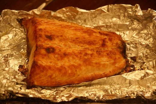 妻子假日到陽明公園旁魚攤,花260元買了兩片鮭魚,想說整片肉手續會單純些,先在肉上灑點鹽,我可不喜歡太鹹,接著用鋁箔紙當襯墊,鋁箔紙要折些皺折,讓油可以滴落不會沾濕魚肉,魚肉表面倒不用鋁箔紙包裹,再放在烤盤上送入烤箱,我們烤箱是950瓦,怕烤太焦,分三次加熱,每次五分鐘,共計十五分鐘。