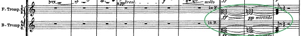 另一個升G音雖然是主調a小調的導音,但在此處被強調,並不太尋常,因為其作用主要是導向主音a。最妙的是,這些音在第四樂章開頭全部一起奏響(54:17),成為一個非常陰森恐怖的和弦,而豎琴則撥奏這些音,更加深其可怕,甚至邪惡感。