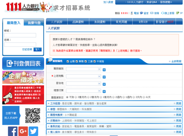 剛剛也使用1111人才招募系統的人才試搜功能,發現非常驚人的事,原來廠商舊是依照我們的履歷欄位設定條件找到我們的,像下圖,主要的條件有職業類別、上班地點、居住地、理想行業和履歷更新日,然後更細項的條件有工作經歷、學歷、求職條件、專長技能和個人條件,難怪人力銀行總是鼓勵我們將履歷填好填滿,原來就是為了讓自己的履歷能見度更高,而且求職其間時長庚新履歷也是很重要的,求才老闆想要看最新鮮的,他可能就會在履歷更新日選擇3天內有更新的履歷,如果你是萬年不變的履歷,連出現的機會也沒有,所以有空就多去改一下吧~
