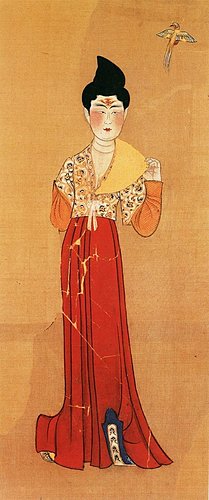 註:從人物動態及手臂姿勢看來,披帛的一端從胸前的衣襟中伸出,繞至背後。披帛另一端則由右手牽拈。半臂這種服勢,早在初唐即已出現,不僅在中原地區流行,西北地區也同樣風行。