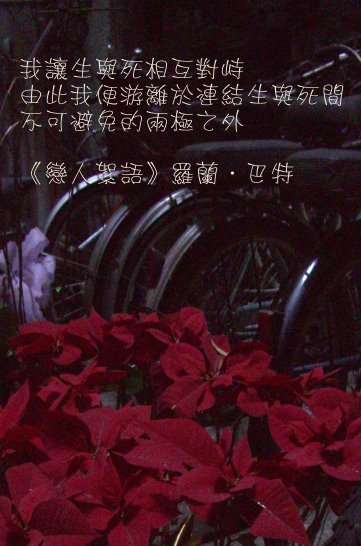 往者已矣,來者可追。成、住、壞、空,是人生的過程。妳是一位勇者,人的生命必有終極,只是先後長短的不同而已,走過去,柳暗花明又一村,加油!謝謝鼓勵.....是走過去了!只是忽然撞見回憶了吧! 也可 於 2009/02/22 10:39回覆