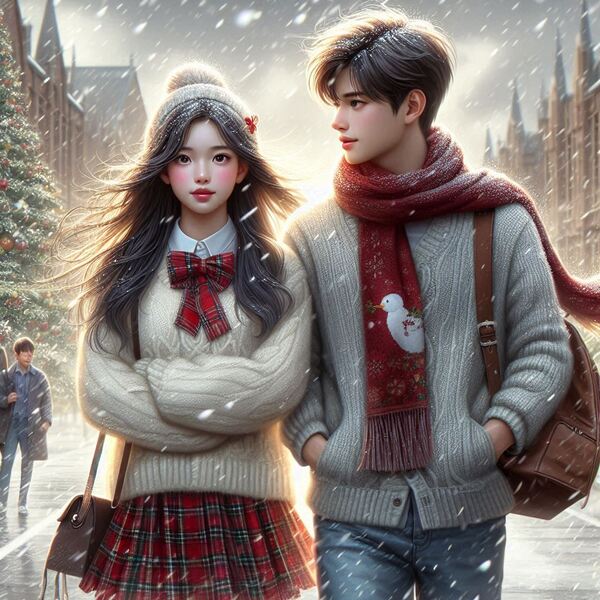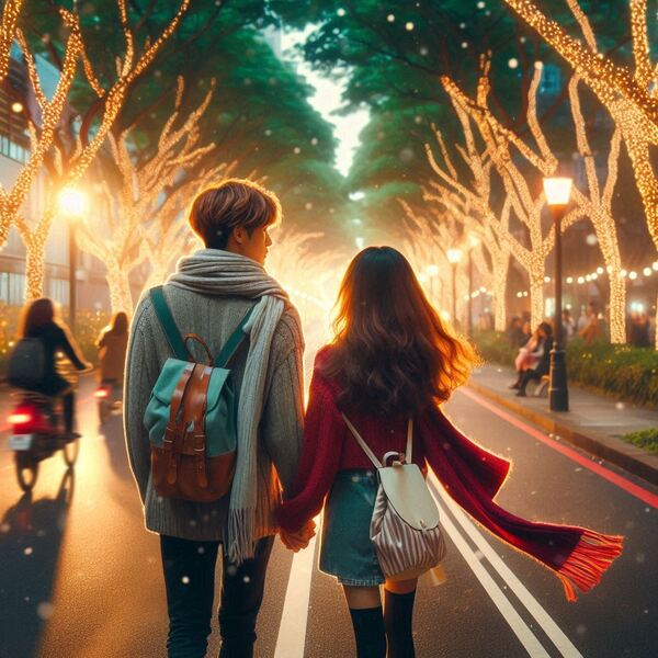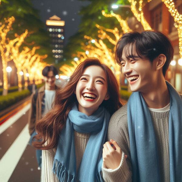 飄風的圍巾髮梢 路上情侶輕顰笑語