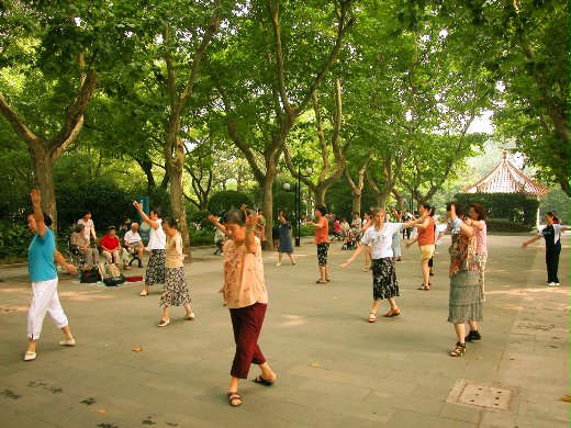 上海早晨的公園與台北、北京一樣,聚集了眾多晨運的老人。但上海與台北的相似程度更勝於北京,這裡是繁忙、快步調的,公園也是生氣勃勃、熱鬧滾滾,沒有北京特有的慵懶、懷舊氣息,中國風味亦沒這般濃厚,所以看不見唱戲、踢毽、拉扯鈴等民俗活動,這兒跳的是土風舞、社交舞,唯一不變的是全球華人都熱愛的太極拳。