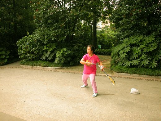 她注意到我了,對我招招手,喊我過來。走近發現是一位有點年紀的大嬸,笑容可掬,將手上的兩只球拍交給我,要我試試。我有些猶疑,但她的盛情令我難卻。剛到此地,我的防備心讓我與人築起一道高牆,我拎著皮包,頭掛著相機,完全無法伸展開來,並非做運動的樣子。她要我將包放在一旁,我望望四周神情緊張,她要我甭擔心。我將皮包放在腳邊,接受她悉心指導,笨手笨腳地開始揮舞起球拍。