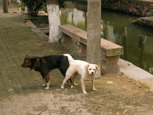 一個暖洋洋、適合曬蘿蔔的秋日午後,我與卡夫在錦溪沿著水道信步亂走,越過無數的古橋,越走越深入恬靜處,巧遇一六百多歲的古橋,名「天水橋」,橋墩兩側儁刻一則有趣的對聯:「願天常生好人,願人常做好事」。平凡無奇,但反覆誦念後,發人深省,是如此貼切而生動地反映小老百姓的願望啊!繞到橋另一面,也刻了一句對聯:「萬惡淫為首,百善孝為先。」此時卡夫就奇了:「為何萬惡淫為首?」「我們最近看幾部伍迪艾倫的電影,不都講這主題。」我立馬回嘴。伍迪艾倫備受推崇的一部電影《愛與罪》(Crimes and Misdemeanors)訴說一位醫師因情婦打算讓原配得知她的存在,摧毀他原本幸福的婚姻與成功的事業,由單純外遇的不當行為(Misdemeanor)轉變成殺人的罪愆(Crime)。伍迪似乎熱衷此題材,在比較近期的一部電影《愛情決勝點》(Match Point)又老調重彈,用更嚴肅慎重的手法處理這類型悲劇。提到伍迪艾倫的電影,卡夫彷彿猛然想起甚麼,便要跟我聊起他在酒店聽一小姐轉述的故事。話才說一半,我們面前就出現兩隻狗演起了活春宮,一隻黑中帶棕,有牧羊犬血統的雜種狗,騎在一瘦長短毛的白狗身上。見我們路過,兩位中斷交歡,換了姿勢,但尾部相連仍交纏在一起。我們有些尷尬,又覺趣味,喀嚓拍了一張相片。卡夫繼續他的故事:「有個高層在酒店結識一小姐,收為情婦,後欲與情婦分手,情婦心有未甘便威脅告發,結果此官竟買兇殺死此情婦,現身敗名裂、身陷囹圄……。」多麼熟悉的故事,在社會新聞版面,你我閒話家常當中,此等情節屢見不鮮。伍迪不過凸顯社會現實,洞察人性罷了。「萬惡淫為首」倒有幾番道理。