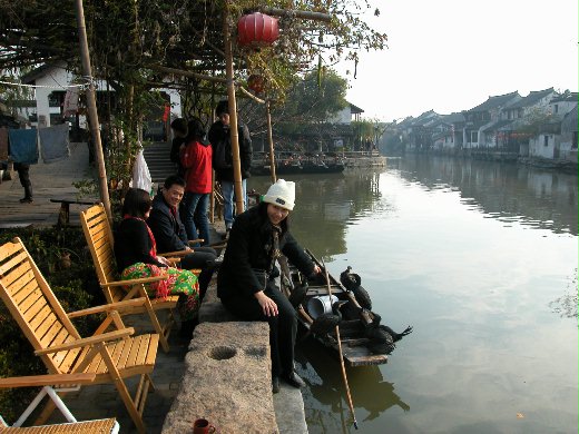 結果,西塘意外地令我失望。但正當自己被失望的情緒淹沒、喪失正確判斷力時,卡夫建議我們停下腳步。他說:「每次旅行總是走來走去,有時候應該坐下甚麼也不做。看看藍天、曬曬太陽。」我有些猶豫,但決定試試看。我們選了個岸邊,坐下,叫壺茶,放鬆每條筋骨、每個細胞,用最舒服的姿勢癱在躺椅裡,雙腳翹起放在堤上。時光彷彿瞬間停滯,我豎起耳朵傾聽流水潺潺、微風捉弄樹葉窸窣的聲音,眼前景物都成了刻意慢動作的電影,小船緩緩駛來,上面載著一群我長久誤會為鴨子的鳥類。Google大神告訴我牠叫鸕鶿,俗名魚鷹,是種專門飼養來抓魚的猛禽。黑得發亮的羽毛中神氣地長著鮮黃色的鳥喙,氣宇軒昂立於船頭,蓄勢待發。一隻隻陸續下水,卻陸續失敗。漁夫大嘆今日運氣太壞。突然,一隻魚鷹躍入水中好像咬住了某件物事。「抓到了嗎?」我也一起緊張起來。但見那頭鳥嘴裡緊咬一只酒瓶不放,被漁夫撈了上來。漁夫費了一番功夫才把酒瓶從鳥嘴卸下。鳥對自己身為同伴中唯一有收穫者甚感得意,雙翅高展,抬頭挺胸,一副目空一切貌。其牠鳥對其挑釁視若無睹,惟有一隻耐不住性子當場吐槽。兩隻鳥便如同在吵架,分別將喉嚨鼓得滿滿的,脖子向後仰得快要折斷的樣子,接著,一種來自外太空的異聲,「嗄嗄……」劃破長空。一隻嗄完,換另一隻。此起彼落,足足嗄了二十分鐘才分出勝負。當我們以為可以耳根清靜時,牠們又開始搶起一塊木板,各自咬住一端不放,另一場長期對戰又展開了。