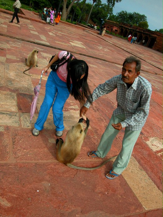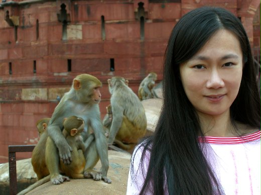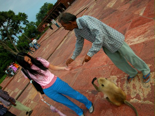 (麗貝卡那天上午在阿格拉城堡與猴群溫馨的合照。)