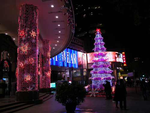 今夏遷居上海後,我首度在異鄉歡度聖誕,我很期待是個白色聖誕。但溫室效應已經使上海多年未曾降雪了。平安夜,上海飄起濛濛細雨,冷颼颼的,雪,跟忽視我童年的聖誕老人一樣,終究沒來……。畢竟早過了作夢的年紀,天不從人願,總有自得其樂的方法。如大寧國際商業廣場便造了雪,特定時間為盼雪的人降下。假的,我不喜歡。我寧可淋雨。於是我跟卡夫淋著雨沿著淮海路來到新天地。淮海路此刻亦恢復昔日榮光,霞飛了起來,璀璨華美得難以逼視。各家百貨、餐廳聖誕樹爭奇鬥艷,路上迎面走來成群頭戴聖誕紅帽的青年男女,臉上盡是歡欣鼓舞、喜氣洋洋。從小到大頭一次被這般濃厚的聖誕氛圍環繞。被資本主義徹底洗禮的上海,人人都追求小資生活、嚮往小資情調,而聖誕節當中豐沛的商機商人怎看不見?百貨、PUB、KTV、飯店延長營業至深夜,使出渾身解數吸引顧客上門,門口踩高翹的、扮小丑的、兔女郎辣妹……不畏風寒、熱情有勁,宛如在上海街頭辦起了化妝舞會。而這一切在新天地被發揮至淋漓盡致。人潮的洶湧在此達到鼎盛。